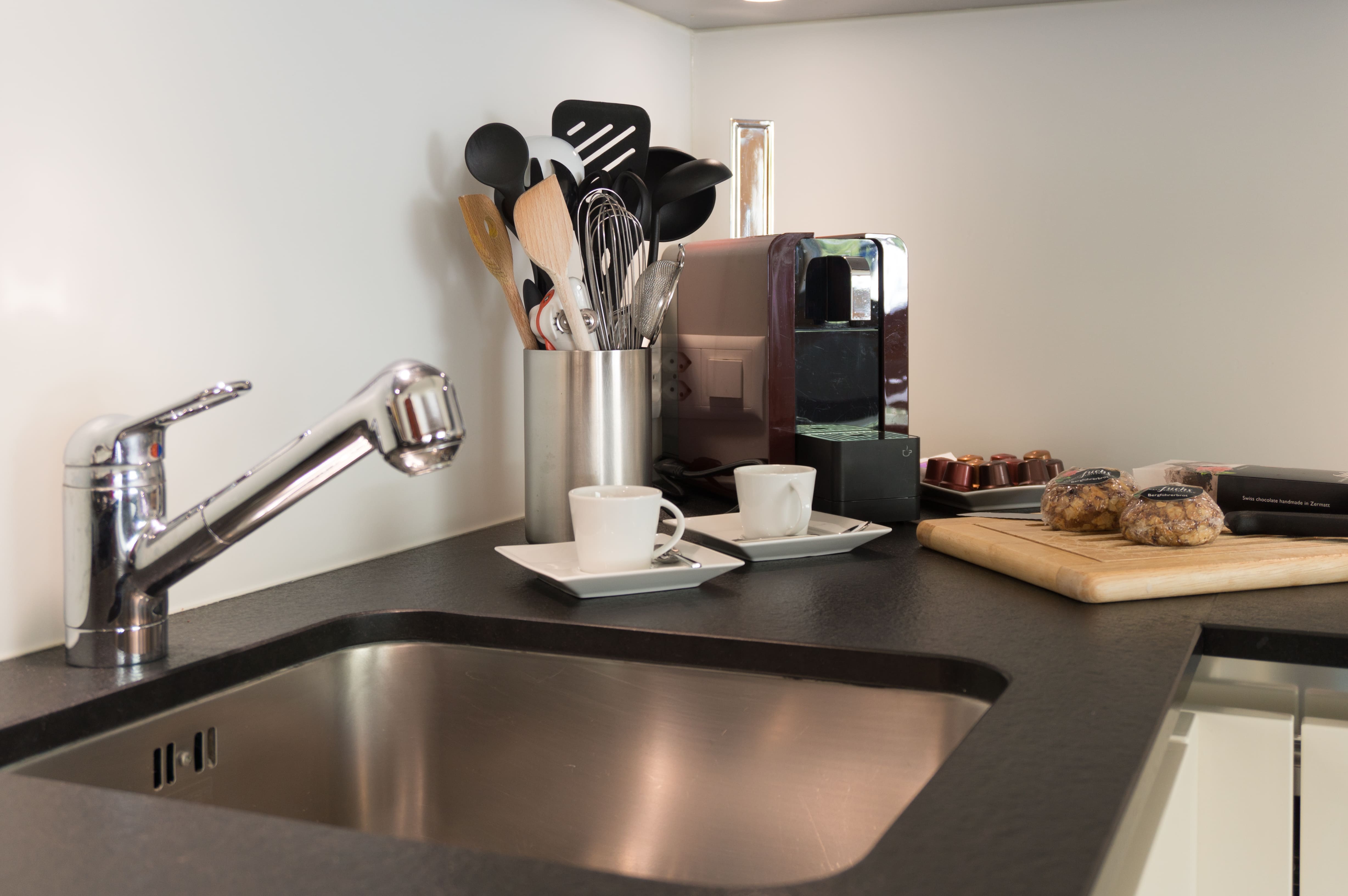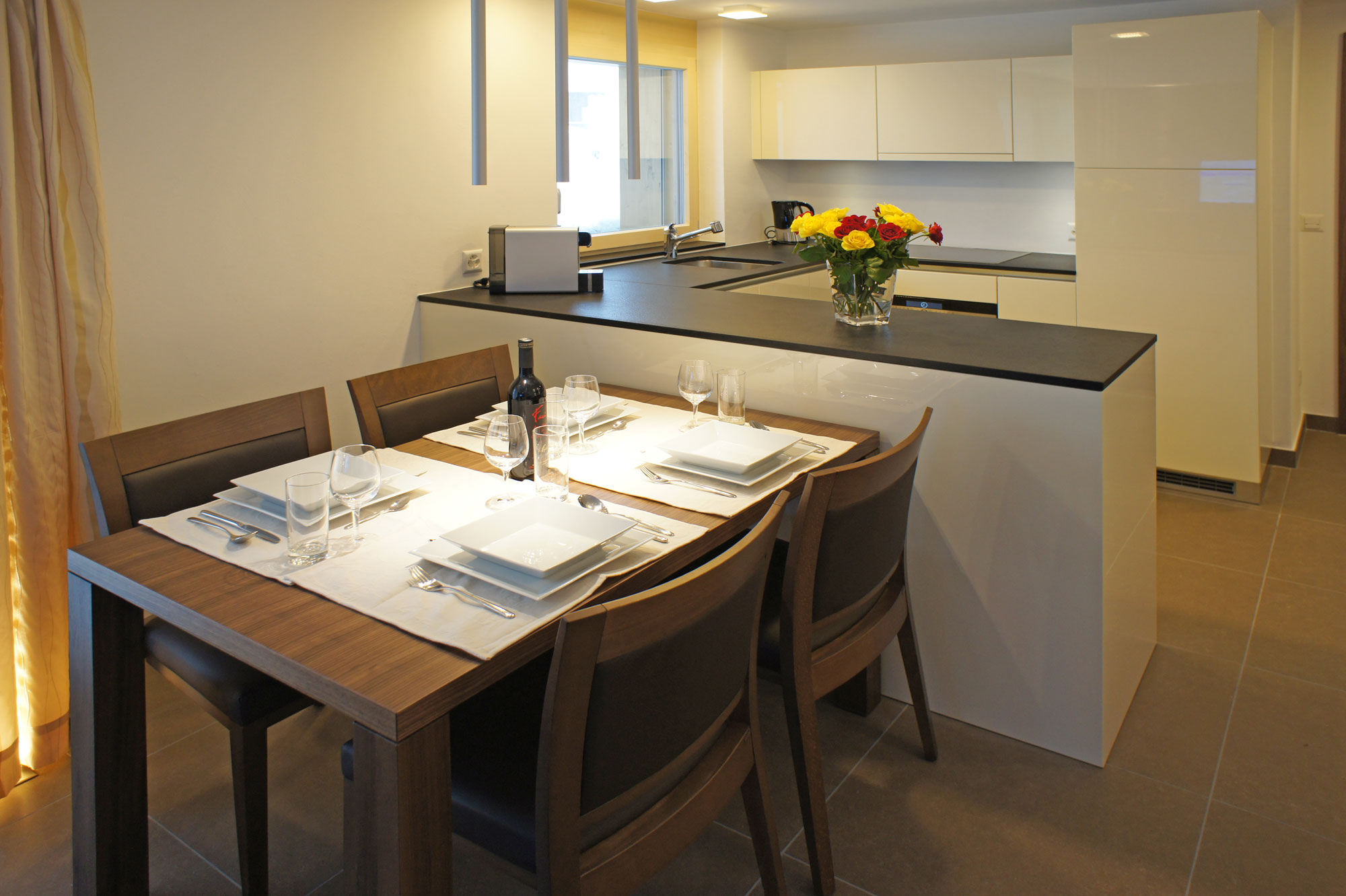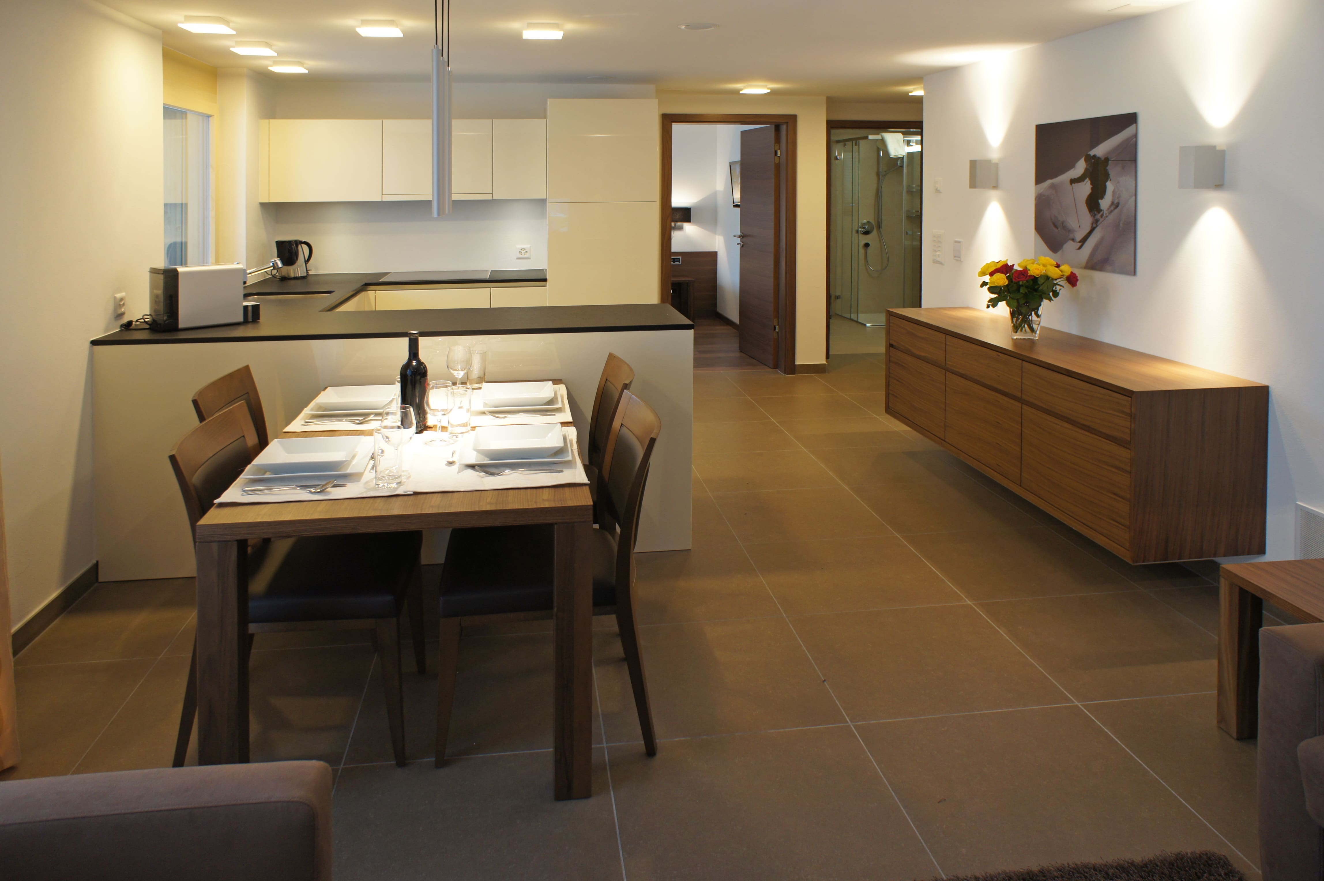 Wonderful, spacious one bedroom apartment of 60m2. Large terrace with evening sun. Fully equipped kitchen with coffee machine, over/steamer, dishwasher, Raclette and Fondueset. Living room with sofa-bed, radio, cable TV and WiFi. 1 double bedroom with TV, 1 bathroom with shower/toilet and hairdryer.